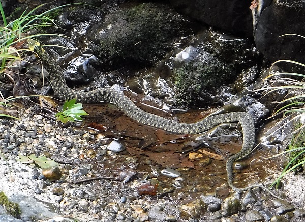 もう一歩で踏むところだった、頭が黄色いヤマカガシ